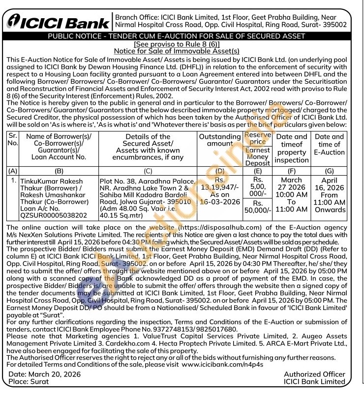 Plot No. 38, Aaradhna Palace, NR. Aradhna Lake Town 2 & Sahiba Mill Kadodra Bardoli Road, Jolwa Gujarat-395010 (Adm 48.00 Sq. Vaar i.e. 40.15 Sq.mtr)