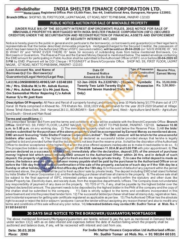Contact Authorised officer. Mr. Sudhir Tomar at Mob. No. +91 9818460101