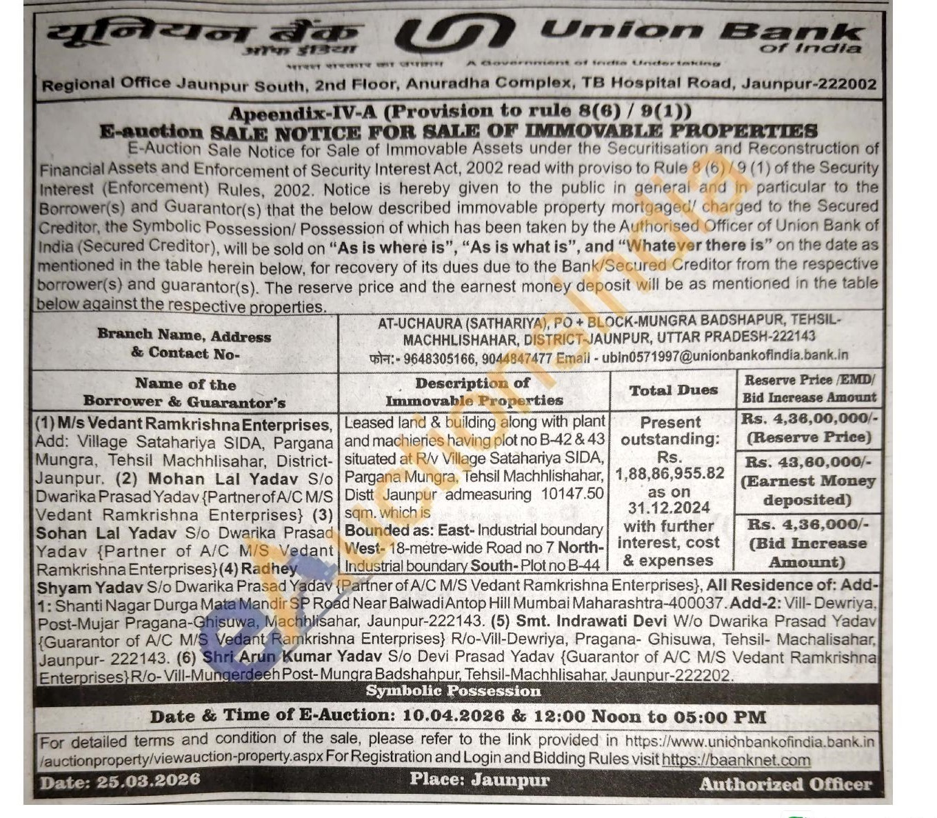 Leased land & building along with plant and machieries having plot no B-42 & 43 situated at R/v Village Satahariya SIDA, Pargana Mungra, Tehsil Machhlishahar, Distt Jaunpur admeasuring 10147.50 sqm. which is Bounded as: East- Industrial boundary