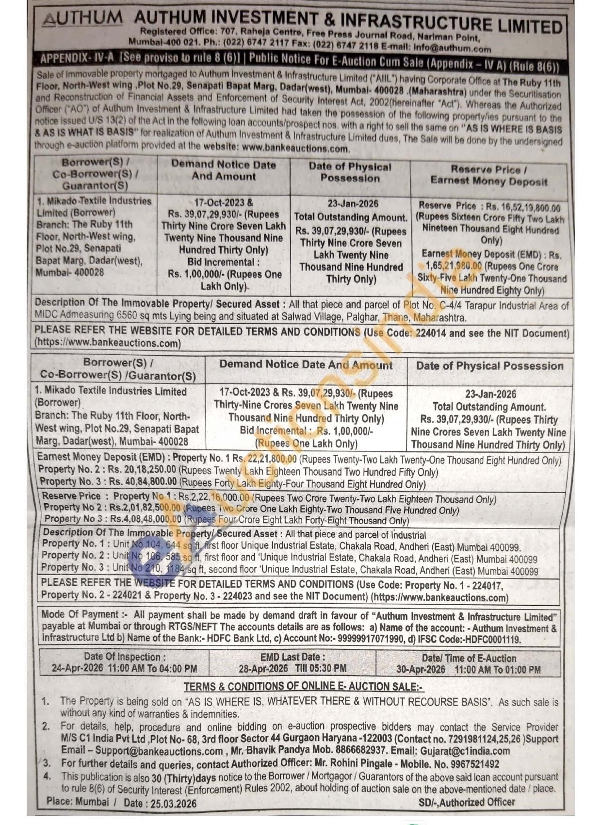 Description Of The Immovable Property/ Secured Asset: All that piece and parcel of industrial Property No. 2: Unit No 106, 585 sq ft, first floor and 'Unique Industrial Estate, Chakala Road, Andheri (East) Mumbai 400099