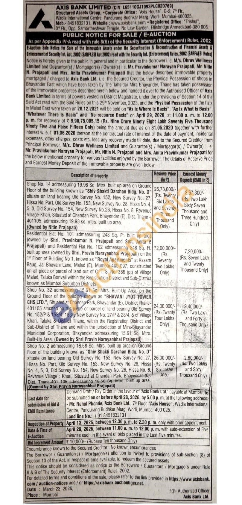 Residential Flat No. 101 admeasuring 248 Sq. Ft. built up area (owned by Shri. Pravinkumar N. Prajapati and Smt. Anita P Prajapati) and Residential Flat No. 102 admeasuring 248 Sq. FL. built up area (owned by Shri. Pravin Narayanbhai Prajapati) on the 1 Floor, of Building No 1, known as "Royal Apartments" at Kasam Baug, Jai Bhavani Lane, Malad (E), Mumbai-400 067, constructed on all plece or parcel of land out of C. T. S. No. 386 (pt) of Vilage Malad, Taluka Borivali within the Registration District and Sub-District known as Mumbai Suburban Districts.