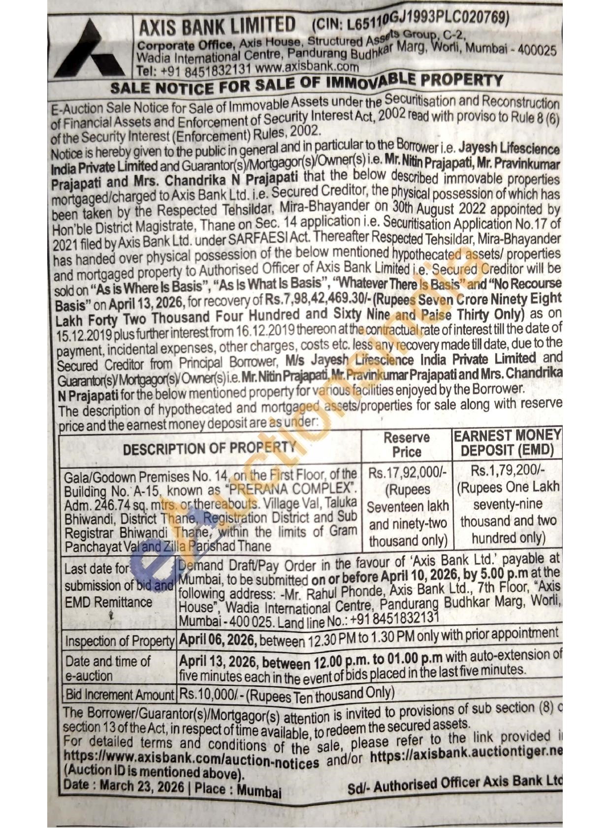 Gala/Godown Premises No. 14, on the First Floor, of the Building No. A-15, known as "PRERANA COMPLEX". Adm. 246.74 sq. mtrs. or thereabouts. Village Val, Taluka Bhiwandi, District strict Thane, Registration District and Sub Registrar Bhiwandi Thane, within the limits of Gram Panchayat Val and Zilla Parishad Thane