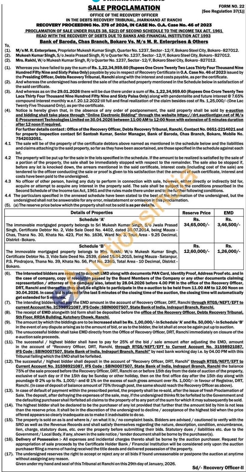 The immovable mortgaged property belongs to Mrs. Rakhi, W/o Mukesh Kumar Singh, Certificate Debtor No. 3, Vide Sale Deed No. 2539, dated 15.04.2015, being Mauza-Satanpur, P.S. Pindrajora, Thana No. 39, Khata No. 56, Plot No. 2365, Total Area-10 Decimal, District-Bokaro.