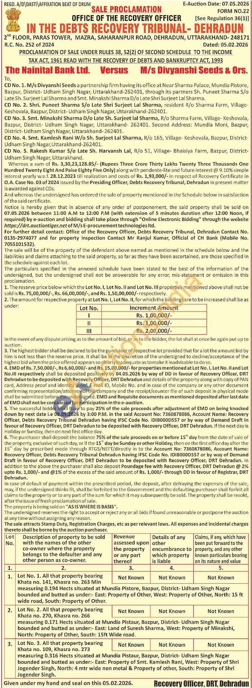 Lot No. 2. All that property bearing Khata no. 270, Khasra no. 266 measuring 0.171 Hects situated at Mundia Pistaur, Bazpur, District- Udham Singh Nagar bounded and butted as under:- East: Land of Suresh Sharma, West: Property of Minakshi, North: Property of Other, South: 15ft Wide road.