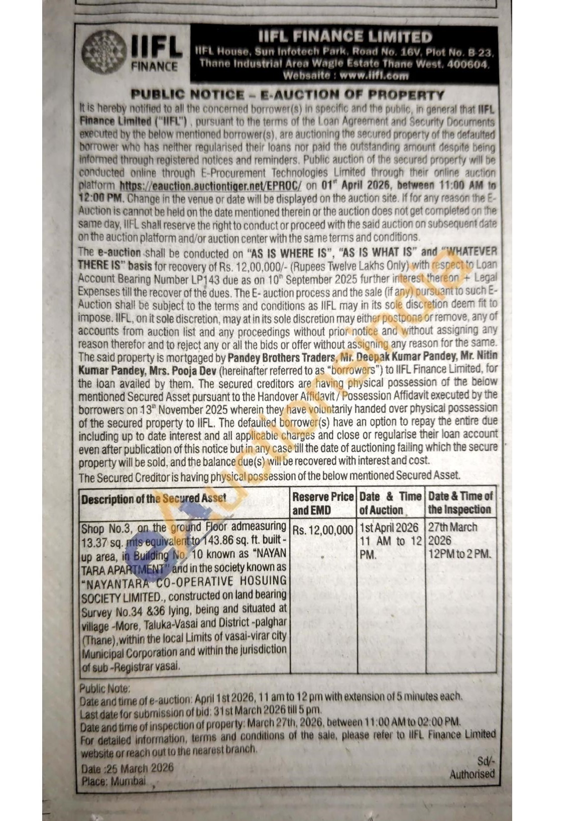 Shop No.3, on the ground Floor admeasuring 13.37 sq. mts equivalent to 143.86 sq. ft. built-up area, in Building No. 10 known as "NAYAN TARA APARTMENT" and in the society known as "NAYANTARA CO-OPERATIVE HOSUING SOCIETY LIMITED., constructed on land bearing Survey No.34 &36 lying, being and situated at village-More, Taluka-Vasai and District-palghar (Thane), within the local Limits of vasai-virar city Municipal Corporation and within the jurisdiction of sub-Registrar vasal