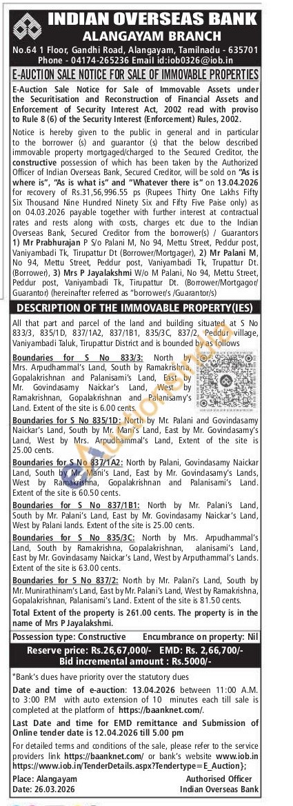 All that part and parcel of the land and building situated at 5 No 833/3, 835/10, 837/1A2, 837/181, 835/3C, 837/2, Peddur village, Vaniyambadi Taluk, Tirupattur District and is bounded by as follows Boundaries for S No 833/3: North by Mrs. Arpudhammal's Land, South by Ramakrishna, Gopalakrishnan and Palanisami's Land, East by Mr. Govindasamy Naickar's Land, West by Ramakrishnan, Gopalakrishnan and Palanisamy's Land. Extent of the site is 6.00 cents. Boundaries for S No 835/1D: North by Mr. Palani and Govindasamy Naickar's Land, South by Mr. Mani's Land, East by Mr. Govindasamy's Land, West by Mrs. Arpudhammal's Land, Extent of the site is 25.00 cents. Boundaries for S No 837/1A2: North by Palani, Govindasamy Naickar Land, South by Mr. Mani's Land, East by Mr. Govindasamy's Lands, West by Ramakrishna, Gopalakrishnan and Palanisami's Land. Extent of the site is 60.50 cents. Boundaries for S No 837/181: North by Mr. Palani's Land, South by Mr. Palani's Land, East by Mr. Govindasamy Naickar's Land, West by Palani lands. Extent of the site is 25.00 cents. Boundaries for S No 835/3C: North by Mrs. Arpudhammal's Land, South by Ramakrishna, Gopalakrishnan, alanisami's Land, East by Mr. Govindasamy Naickar's Land, West by Arputhammal's Lands. Extent of the site is 63.00 cents. Boundaries for 5 No 837/2: North by Mr. Palani's Land, South by Mr. Munirathinam's Land, East by Mr. Palani's Land, West by Ramakrishna, Gopalakrishnan, Palanisami's Land. Extent of the site is 81.50 cents. Total Extent of the property is 261.00 cents. The property is in the name of Mrs P Jayalakshmi.