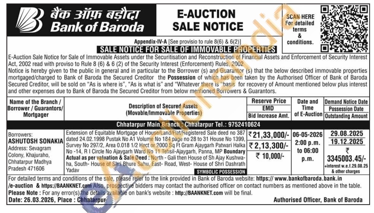 Extension of Equitable Mortgage of House/Land/Flat/Registered Sale deed no 387 dated 24.02.1998 Pustak No A1 Volume No 184 page no 28 to 31 House No 1399, Survey No 297/2, Area 0.018 1/2 Hect or 2000 Sq Ft Gram Ajaygarh Patwari Halka No-14, R I Circle No Ajaygarh Ward No 11 Tehsil-Ajaygarh, Panna, MP Boundary Actual as per valuation & Sale Deed: North-Gali then House of Sh Ajay Kushwa-ha, South- House of Shri Bhure Sahu, East- Road, West- House of Shri Dashrath Yadav
