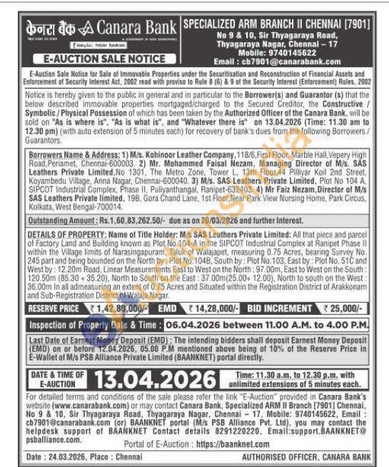 DETAILS OF PROPERTY: Name of Title Holder: M/s SAS Leathers Private Limited: All that piece and parcel of Factory Land and Building known as Plot No.104-A in the SIPCOT Industrial Complex at Ranipet Phase II within the Village limits of Narasingapuram, Taluk of Walajapet, measuring 0.75 Acres, bearing Survey No. 245 part and being bounded on the North by: Plot No. 1048, South by: Plot No. 103, East by: Plot No. 51C and West by: 12.20m Road, Linear Measurements East to West on the North: 97.00m, East to West on the South: 120.50m (85.30+35.20), North to South on the East: 37.00m(25.00+ 12.00), North to south on the West: 36.00m in all admeasuring an extent of 0.75 Acres and Situated within the Registration District of Arakkonam and Sub-Registration District of Walaja Nagar