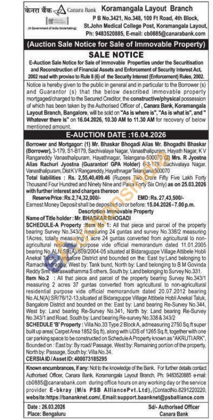 SCHEDULE-A Property Item No 1: All that piece and parcel of the property bearing Survey No.343/2 measuring 24 guntas and survey No.338/2 measuring 1Acres, totally measuring 1 acre 24 guntas converted from agricultural to non-agricultural residential purpose vide official memorandum dated 11.01.2005 bearing No.ALN:SR(A) 509/2004-05 situated at Bidaraguppe Village Attibele Hobli Anekal Taluk, Bangalore District and bounded on the: East by:Land belonging to Ramachandrappa, West by: Tank bund, North by: Land belonging to B M Govinda Reddy Smt. Saraswathamma Sothers, South by: Land belonging to Survey No.331. Item No.2: All that piece and parcel of the property bearing Survey No.343/1 measuring 2 acres 37 guntas converted from agricultural to non-agricultural residential purpose vide official memorandum dated 20.07.2012 bearing No.ALN(A):SR/76/12-13, situated at Bidaraguppe Village Attibele Hobli Anekal Taluk Bangalore District and bounded on the: East by: Land bearing Re-Survey No.344, West by: Land bearing Re-Survey No.341, North by: Land bearing Re-Survey No.343/1 and Road, South by: Land bearing Re-survey No.338 & 343/2 SCHEDULE 'B' Property: Villa No.33 Type 2 Block A, admeasuring 2750 Sq.ft super built up area(Carpet Area 1852 Sq.ft), along with UDS of 1265 Sq.ft, together with one car parking space to be constructed on Schedule A Property known as "AKRUTIARK", Bounded on: East by: By road/Passage, West by: Remaining portion of the property, North by: Passage, South by: Villa No.34.
