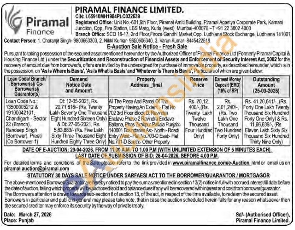 All The Piece And Parcel Of The Property Having An Extent :- Flat No 702 3rd Floor Block D. Ravindra Enclave Phase 2 Ravindra Enclave Baltana, Phas Zirakpur Patiala Punjah:-140601 Boundaries As:- North-Road Entry West-Flat No.703-D East-Flat No.701-D South:- Other Property