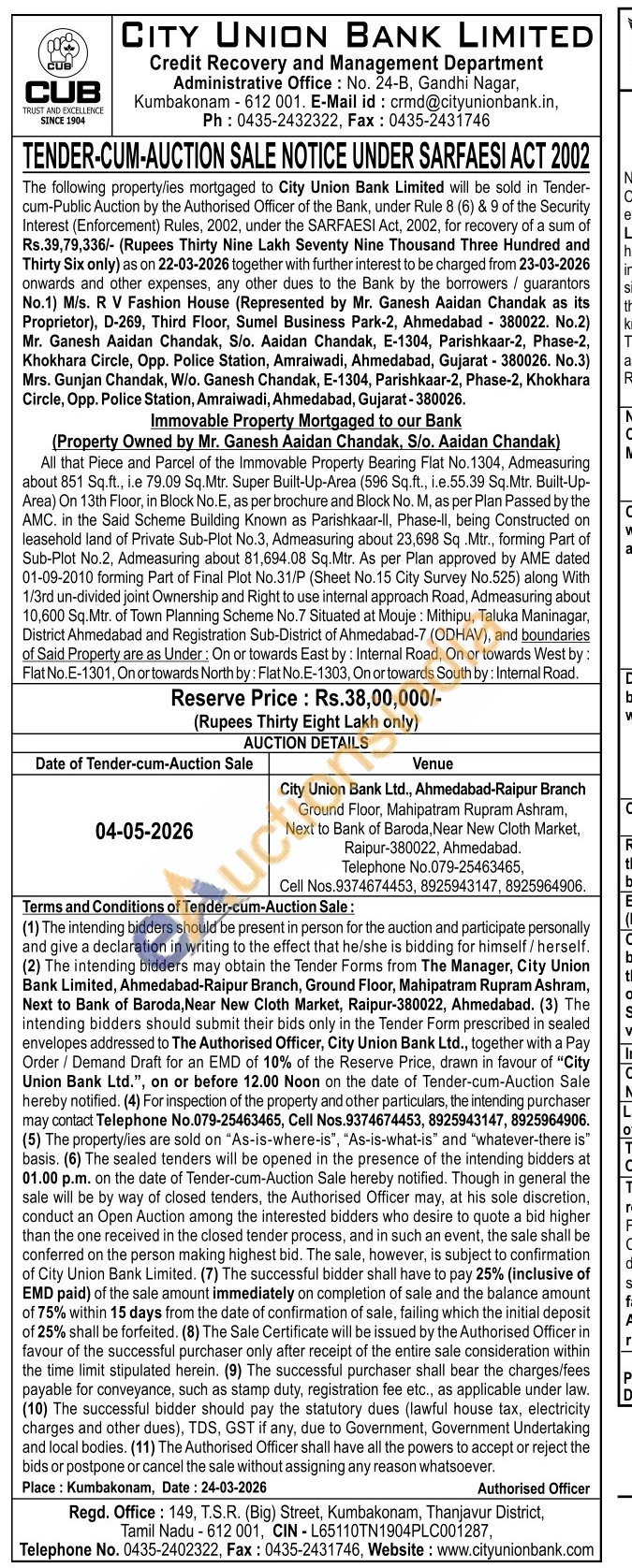 All that Piece and Parcel of the Immovable Property Bearing Flat No. 1304, Admeasuring about 851 Sq.ft., i.e 79.09 Sq.Mtr. Super Built-Up-Area (596 Sq.ft., i.e.55.39 Sq.Mtr. Built-Up-Area) On 13th Floor, in Block No.E, as per brochure and Block No. M, as per Plan Passed by the AMC. in the Said Scheme Building Known as Parishkaar-II, Phase-ll, being Constructed on leasehold land of Private Sub-Plot No.3, Admeasuring about 23,698 Sq. Mtr., forming Part of Sub-Plot No.2, Admeasuring about 81,694.08 Sq.Mtr. As per Plan approved by AME dated 01-09-2010 forming Part of Final Plot No.31/P (Sheet No. 15 City Survey No.525) along With 1/3rd un-divided joint Ownership and Right to use internal approach Road, Admeasuring about 10,600 Sq.Mtr. of Town Planning Scheme No.7 Situated at Mouje: Mithipu, Taluka Maninagar, District Ahmedabad and Registration Sub-District of Ahmedabad-7 (ODHAV), and boundaries of Said Property are as Under: On or towards East by: Internal Road, On or towards West by: Flat No E-1301, On or towards North by: Flat No. E-1303, On or towards South by: Internal Road.