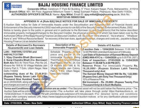 Schedule Property: All that piece and parcel of the immovable Property Being Third Floor (Lhs Unit) Without Roof Rights, Plot No. 24, Out Of Khasra No. 18/6 & 16. Village Matiala Jain Colony, Part II, T Ext. Uttam Nagar. New Delhi 110059