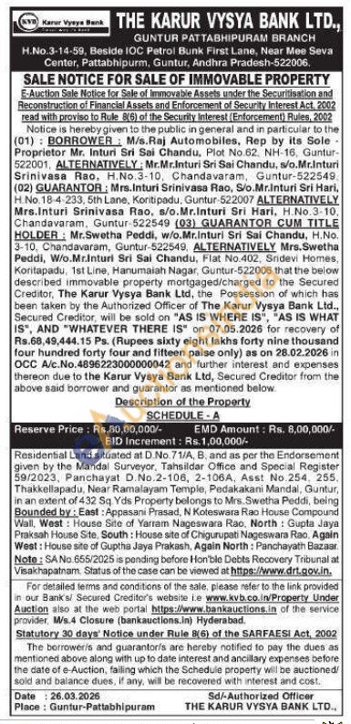 Residential Land situated at D.No. 71/A, B, and as per the Endorsement given by the Mandal Surveyor, Tahsildar Office and Special Register 59/2023, Panchayat D.No.2-106, 2-106A, Asst No. 254, 255, Thakkellapadu, Near Ramalayam Temple, Pedakakani Mandal, Guntur, in an extent of 432 Sq Yds Property belongs to Mrs. Swetha Peddi, being Bounded by: East: Appasani Prasad, N Koteswara Rao House Compound Wall, West: House Site of Yarram Nageswara Rao, North: Gupła Jaya Praksah House Site, South: House site of Chigurupati Nageswara Rao, Again West: House site of Guptha Jaya Prakash, Again North: Panchayath Bazaar