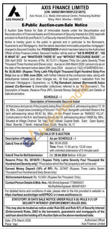 All that piece and parcel of the property being Row House No.8, adimeasuring about 72.19 Sq. Mtrs, Carpet area consisting of Ground First Floor, alongwith undivided Share in the land admeasuring about 89.93 Sq. Mtrs., in the Project known as "MANGO VILLA Constructed on the N.A, land bearing Survey No. 18, admeasuring about 10688 Sq. Mtrs.. Situated at Village Chanod. Tal: Vapi, Dist. Valsad, Gujarat State. East: Open Space, West: Row No. 7, North: Internal Road, South: Row No. 16, 17