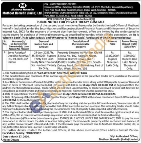Property Situated At Plot No. Old 68 & New No. 102, Rajaram Nagar, Tehsil & District Dewas, (M.P.) 455001 North-Plot No. 201, South- Colony Road, East- Remaining Part of Plot, West-Plot No. 101