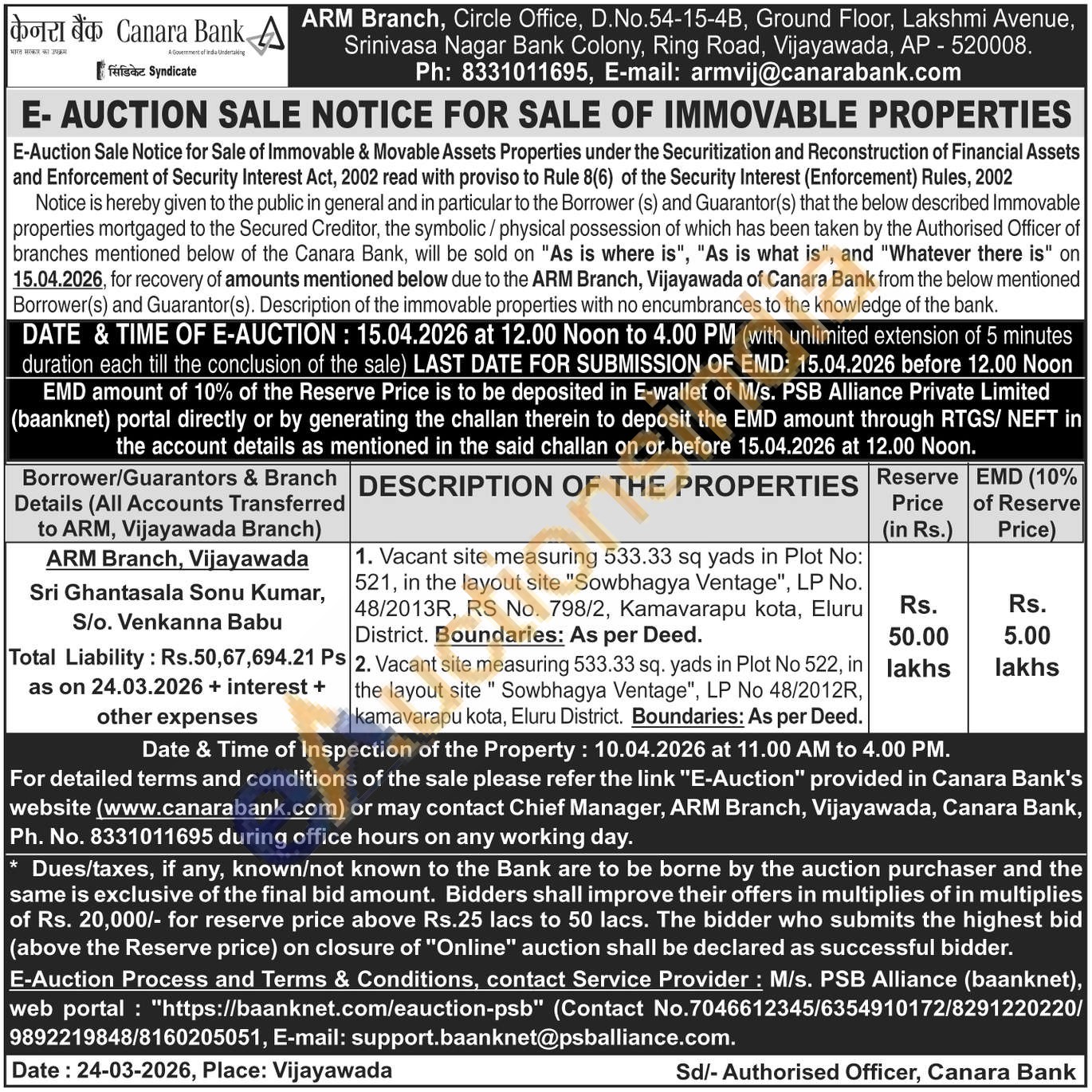 1. Vacant site measuring 533.33 sq yads in Plot No: 521, in the layout site "Sowbhagya Ventage", LP No. 48/2013R, RS No. 798/2, Kamavarapu kota, Eluru District. Boundaries: As per Deed. 2. Vacant site measuring 533.33 sq. yads in Plot No 522, in the layout site " Sowbhagya Ventage", LP No 48/2012R, kamavarapu kota, Eluru District. Boundaries: As per Deed