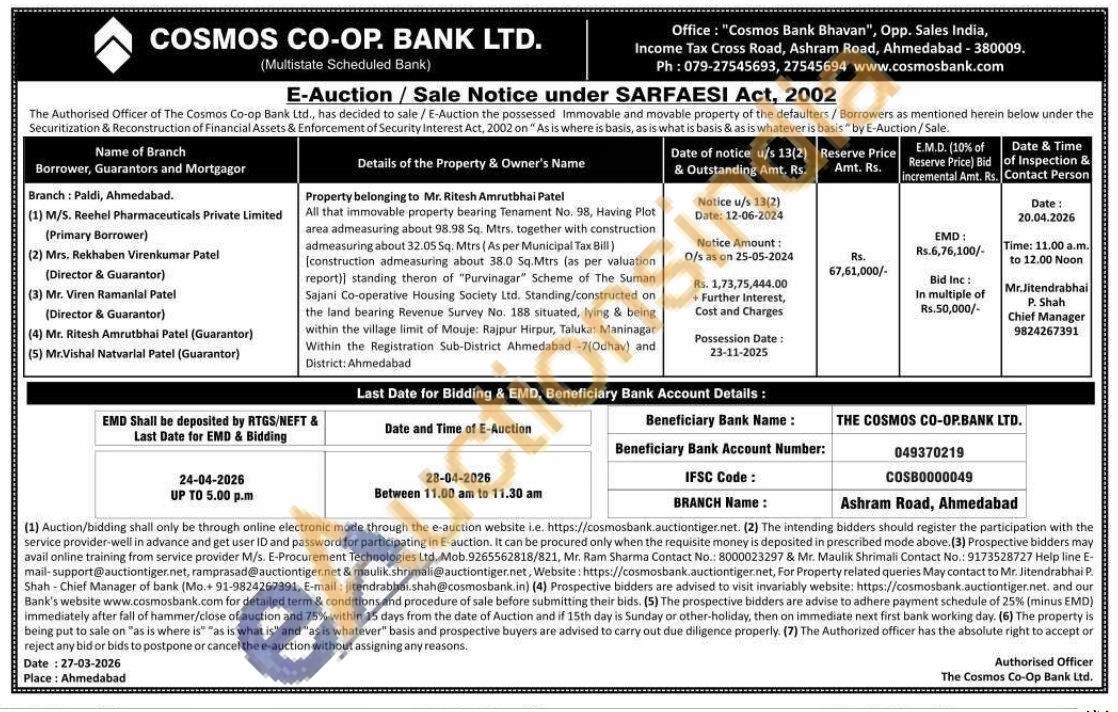 All that immovable property bearing Tenament No. 98, Having Plot area admeasuring about 98.98 Sq. Mtrs. together with construction admeasuring about 32.05 Sq. Mtrs (As per Municipal Tax Bill) [construction admeasuring about 38.0 Sq.Mtrs (as per valuation report)) standing theron of "Purvinagar Scheme of The Suman Sajani Co-operative Housing Society Ltd. Standing/constructed on the land bearing Revenue Survey No. 188 situated, lying & being within the village limit of Mouje: Rajpur Hirpur, Taluka: Maninagar Within the Registration Sub-District Ahmedabad -7(Odhav) and District: Ahmedabad