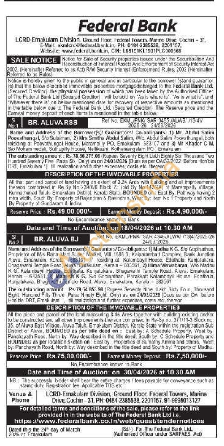 All the piece and parcel of the land measuring 3.15 Ares together with building existing and for to be constructed and all other improvements thereon comprised in Re-Sy no. 371/11-3 Block no. 35, of Alluva East Village, Aluve Taluk, Ernakulam District, Kerala State within the registration Sub District of Aluva, BOUNDED as per title deed on East by: A Schedule Property, West by: Panchayath Road, North by. Way described in the title deed. South by: C Schedule Property and BOUNDED as per location sketch on East by: Properties of Sumathy Amnia and others, West by: Panchayath Road, North by: Way described in the title deed and South by: Property of Madhu