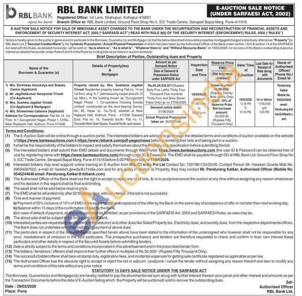 Property owned by: Mrs. Sushama Jagdish Trivedi Residential property bearing Flat no. 14 on 1st floor, wing "A-1" (admeasuring carpet area 24.15 sq. Mtrs.), in the building known as "Guruganesh Nagar Phase I Co-operative Housing Society Limited constructed on the land bearing Survey. No. 82, Hissa no. 7a+7b+8, situated at Near Rajlaxmi Hall, Kothrud, Pune 411038 Towards East: Flat no. 15. Towards South: Flat no. 11. Towards West: Open Space, Towards North: open space