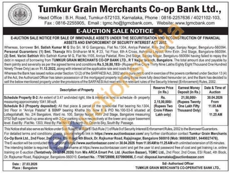 Schedule Property B-2: An extent of 3.47 undivided right, title & interest in land in schedule -B- property measuring approximately 1041.98 sqft. Schedule B-3 (Property deposited): All that piece & parcel of the residential Flat bearing No.1304, 3rd Floor in "Anriya Palatial & BBMP bearing Khatha No. New 8 & PID No.100-53-8 situated at Lottegollahalli, No. 2/4 Bangalore, Ward no. 100, Sanjay Nagar, RMV 2nd Stage, Bangalore measuring 3752 Sqft super built-up area along with 2 Car parking space respectively at the lower and upper basement level. East By: Flat No. 1303, West By: Flat No. 1305, North By: Open to Sky, South By: Passage.