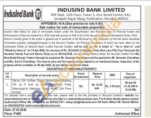 Flat no. 104, 1st floor, Dream Homes Heera Building, Satavnagar At Hadapsar, Taluka Haveli, Dist Pune-411028. 700 sq ft built up area. Handewadi Road,