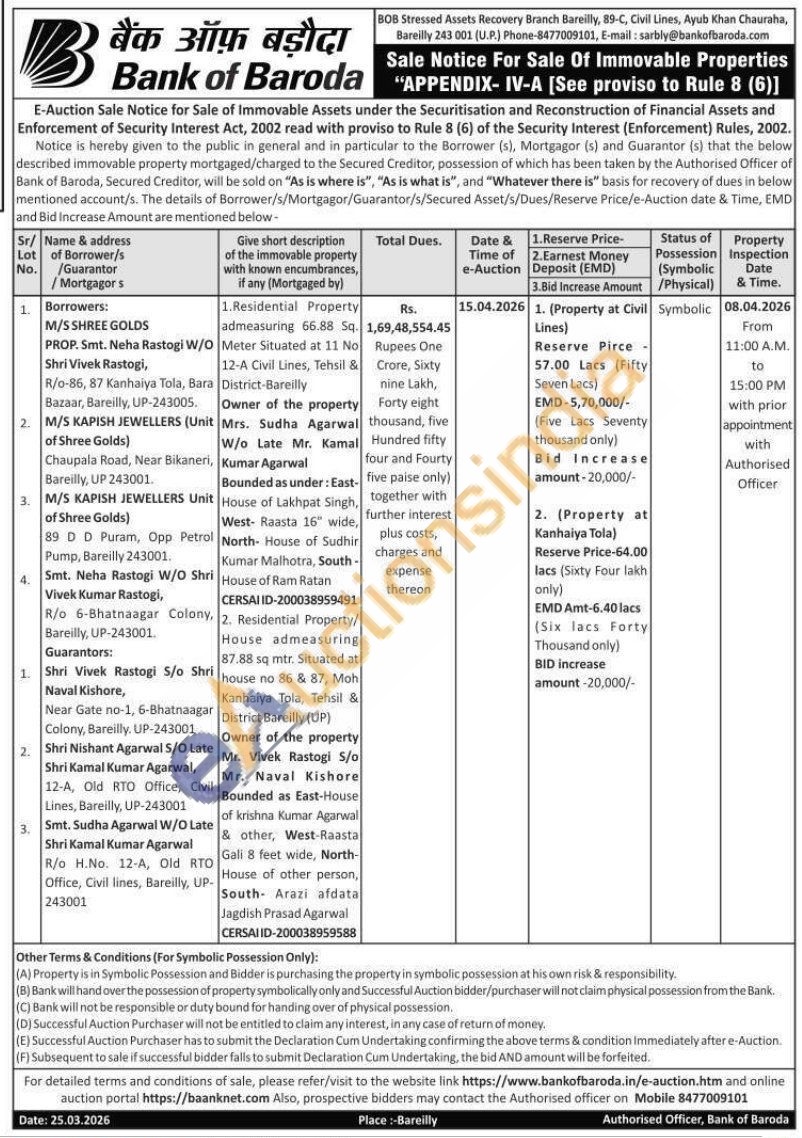 Residential Property/House admeasuring 87.88 sq mtr. Situated at house no 86 & 87, Moh Kanhaiya Tola, Tehsil & District Bareilly (UP) Owner of the property Mr. Vivek Rastogi 5/o Mr. Naval Kishore Bounded as East-House of krishna Kumar Agarwal & other, West-Raasta Gali 8 feet wide, North-House of other person, South- Arazi afdata Jagdish Prasad Agarwal CERSAI ID-200038959588