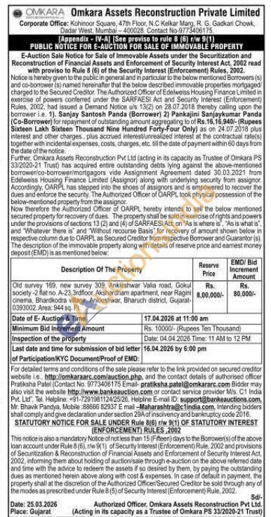 Old survey 169, new survey 309, Ankleshwar Vaila road, Gokul society -2 flat no. A-23 3rdfloor. Akshardham apartment, near Ragini cinema, Bhardkodra village, Ankleshwar, Bharuch district, Gujarat 0393002. Area: 944 sq. Ft.