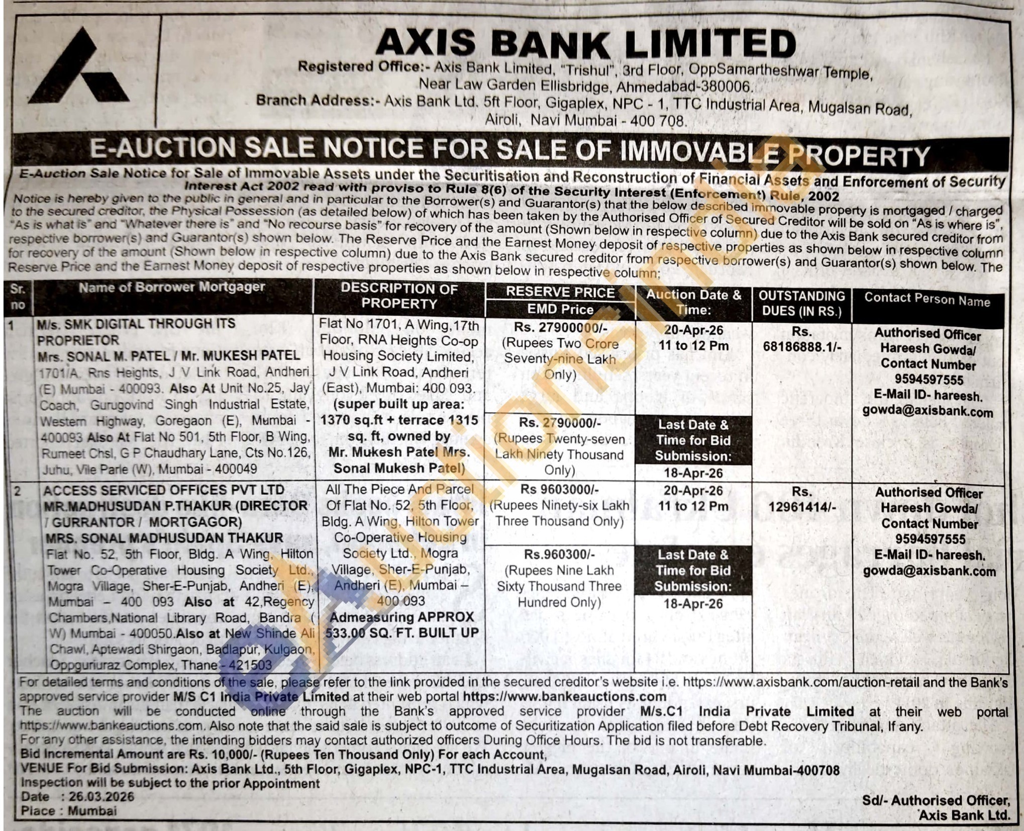 Flat No 1701, A Wing, 17th Floor, RNA Heights Co-op Housing Society Limited, JV Link Road, Andheri (East), Mumbai: 400 093.