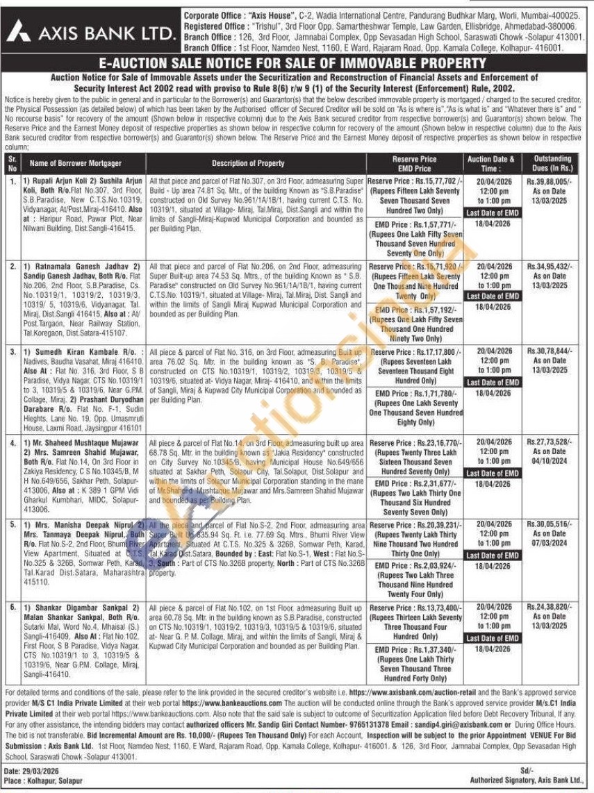 All piece & parcel of Flat No. 316, on 3rd Floor, admeasuring Built up area 76.02 Sq. Mtr. in the building known as "S. B. Paradise", constructed on CTS No.10319/1, 10319/2, 10319/3, 10319/5 & 10319/6, situated at- Vidya Nagar, Miraj-416410, and within the limits of Sangli, Miraj & Kupwad City Municipal Corporation and bounded as per Building Plan
