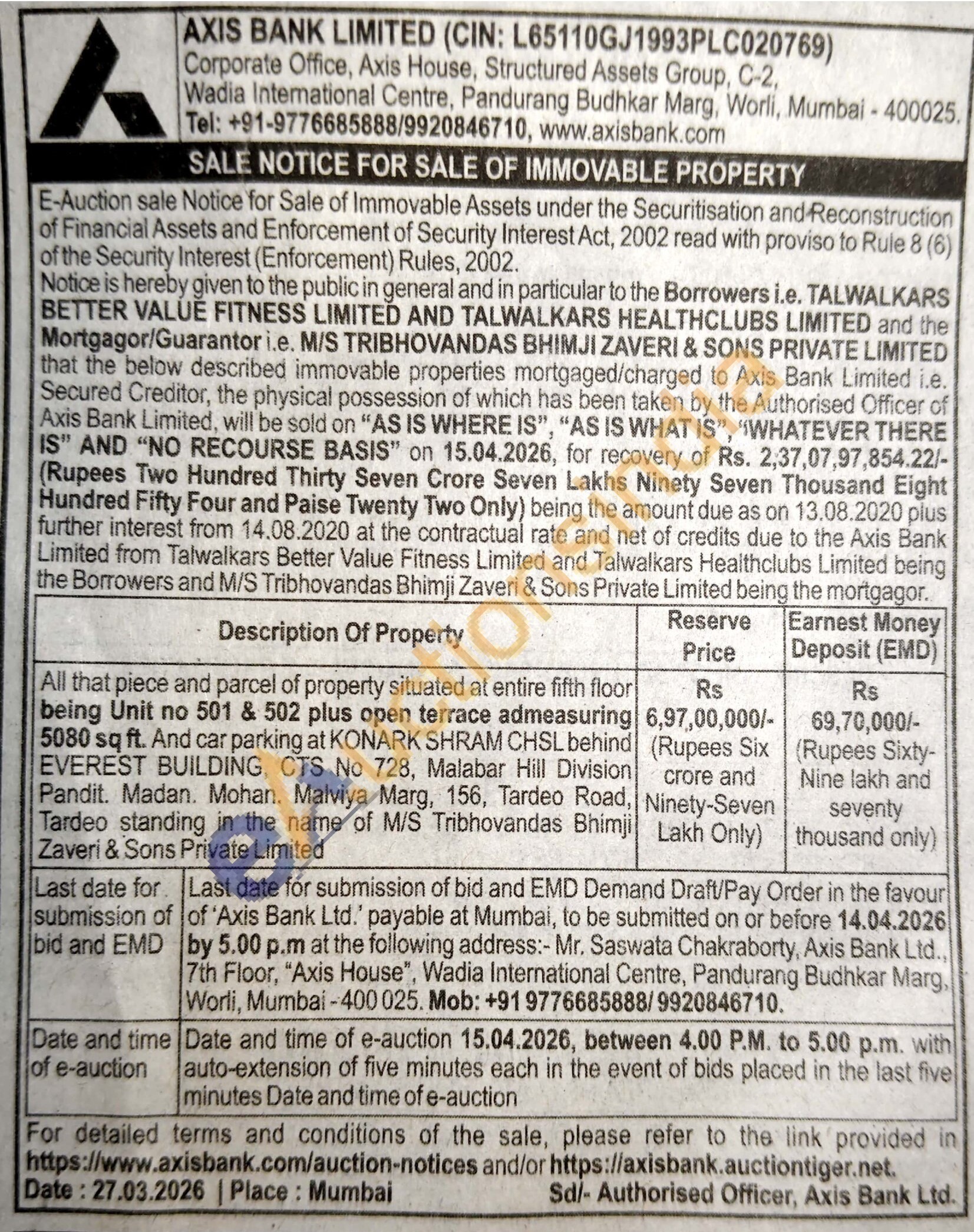 All that piece and parcel of property situated at entire fifth floor being Unit no 501 & 502 plus open terrace admeasuring 5080 sq ft. And car parking at KONARK SHRAM CHSL behind EVEREST BUILDING, CTS No 728, Malabar Hill Division Pandit. Madan. Mohan. Malviya Marg, 156, Tardeo Road, Tardeo standing in the name of M/S Tribhovandas Bhimji Zaveri & Sons Private Limited