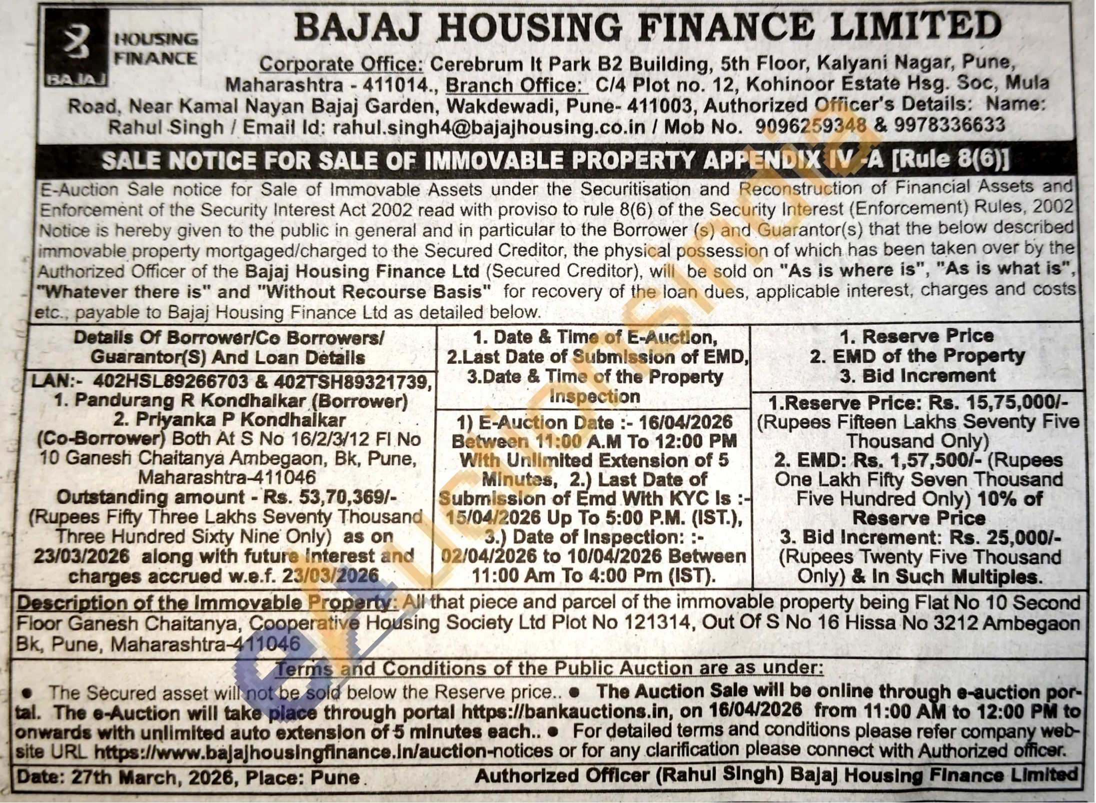 Description of the Immovable Property: All that piece and parcel of the immovable property being Flat No 10 Second Floor Ganesh Chaitanya, Cooperative Housing Society Ltd Plot No 121314, Out Of S No 16 Hissa No 3212 Ambegaon Bk, Pune, Maharashtra-411046