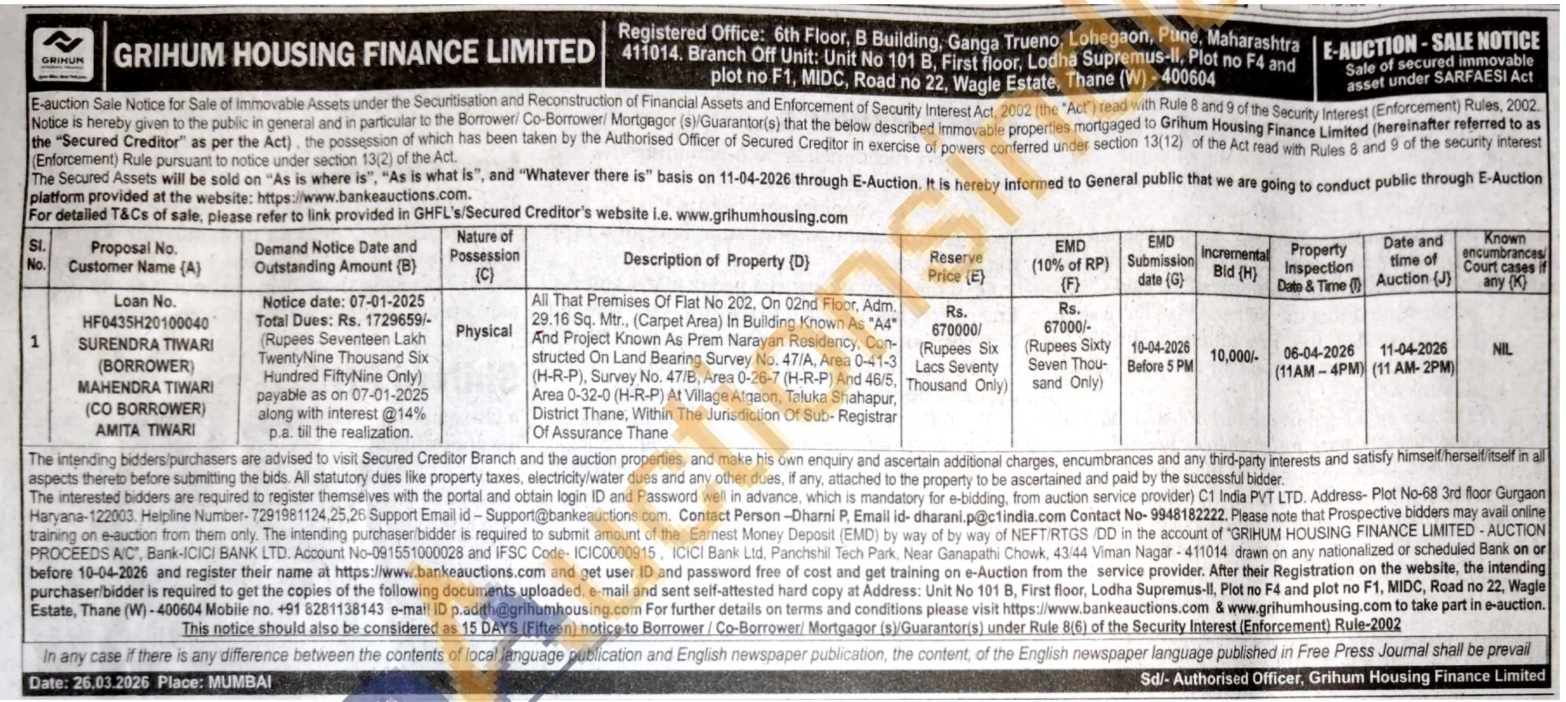All That Premises Of Flat No 202. On 02nd Floor, Adm, 29.16 Sq. Mtr., (Carpet Area) In Building Known As "A4 And Project Known As Prem Narayan Residency, Con-structed On Land Bearing Survey No. 47/A, Area 0-41-3 (H-R-P), Survey No. 47/B, Area 0-26-7 (H-R-P) And 46/5, Area 0-32-0 (H-R-P) Ar Village Atgaon, Taluka Shahapur, District Thane, Within The Jurisdiction Of Sub-Registrar Of Assurance Thane