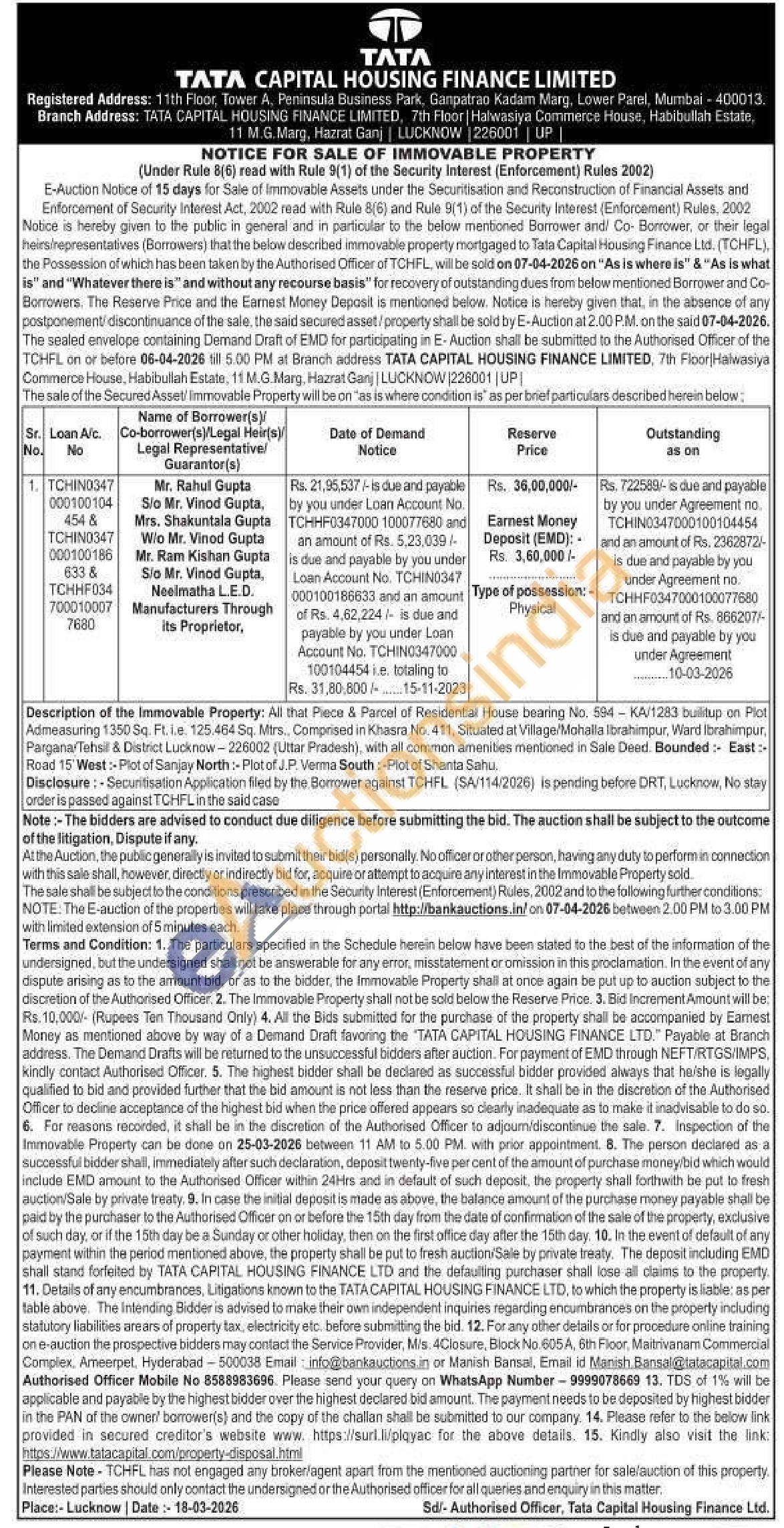 Description of the Immovable Property: All that Piece & Parcol of Residential House bearing No. 554-KA/1283 bullup on Pict Admeasuring 1350 Sq. Ftie. 125.464 Sq. Mirs., Comprised in Khasra No. 411, Situaled at Village/Mohalla Ibrahimpur, Ward Ibrahimpur Pargana/Tehsil & District Lucknow-226002 (Uttar Pradesh), with all common amenities mentioned in Sale Deed. Bounded East Road 15 West:-Plot of Sanjay North:-Plot of J.P. Verma South: -Plot of Shanta Sahu