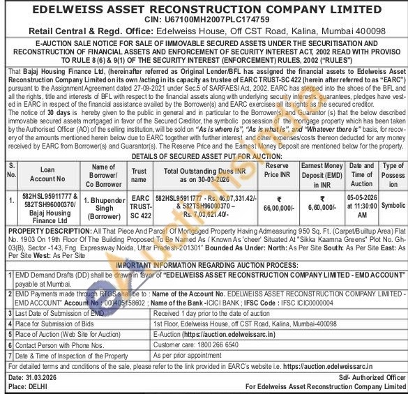 PROPERTY DESCRIPTION: All That Piece And Parcel Of Mortgaged Property Having Admeasuring 950 Sq. Ft. (Carpet/Builtup Area) Flat No. 1903 On 19th Floor Of The Building Proposed To Be Named As / Known As 'cheer' Situated At "Sikka Kaamna Greens" Plot No. Gh-03(B), Sector-143, Fng Expressway Noida, Uttar Pradesh-201301" Bounded As Under: North: As Per Site South: As Per Site East: As Per Site West: As Per Site