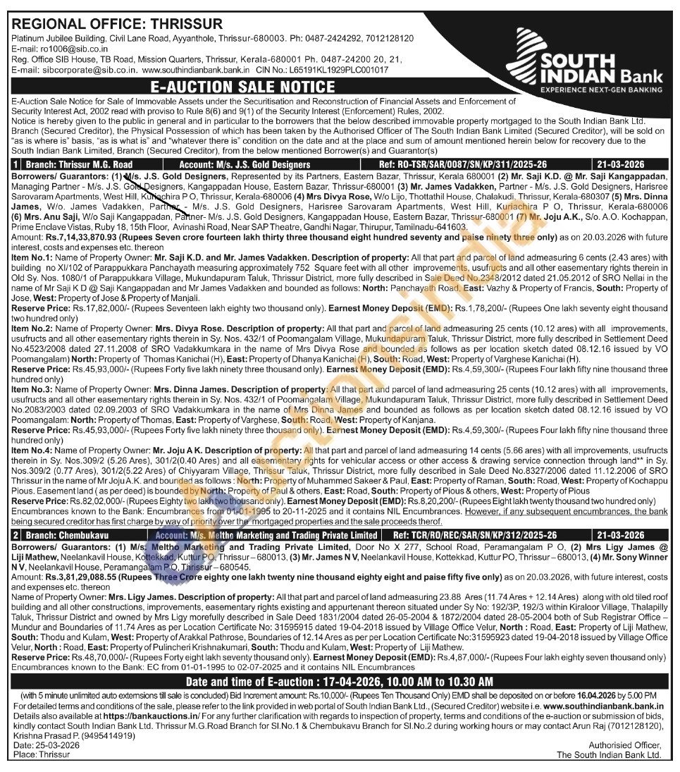Item No.4: Name of Property Owner: Mr. Joju A K. Description of property: All that part and parcel of land admeasuring 14 cents (5.66 ares) with all improvements, usufructs therein in Sy. Nos.309/2 (5.26 Ares), 301/2(0.40 Ares) and all easementary rights for vehicular access or other access & drawing service connection through land** in Sy. Nos.309/2 (0.77 Ares), 301/2(5.22 Ares) of Chiyyaram Village, Thrissur Taluk, Thrissur District, more fully described in Sale Deed No.8327/2006 dated 11.12.2006 of SRO Thrissur in the name of Mr Joju A.K. and bounded as follows: North: Property of Muhammed Sakeer & Paul, East: Property of Raman, South: Road, West: Property of Kochappu Pious. Easement land (as per deed) is bounded by North: Property of Paul & others, East: Road, South: Property of Pious & others, West: Property of Pious