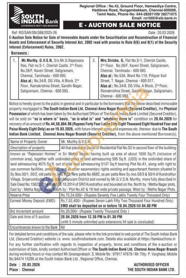 All that piece and parcel of Residential Flat No.S2 in second floor of the building known as "Rajeswari Homes" in Sri Metha Nagar, having built up area of about 1650 Sq.Ft (inclusive of common area), together with undivided share of land admeasuring 595 Sq.ft. (UDS) in the undivided share of land admeasuring 4075 Sq.ft. out of total land admeasuring 5137 Sq.ft bearing Plot No.A1, along with right to use common facilities, amenities, and all other easementary rights existing and appurtenant thereon situated in Sy Nos.50/1, 50/2, old patta no.346, 623. New patta No.6682, as per patta New Sy.nos.50/3 & 50/4 of Kundrathur Village, Sriperumbudur Taluk, Kancheepuram District and owned by Mr.G.V.S.N. Murthy, more fully described in Sale Deed No. 15622/2014 dated 08.10.2014 of SRO Kundrathur and bounded on the, North by: Metha Nagar plots, East by: Metha Nagar plots, South by: Plot No.A2 & 16 feet wide private passage, West by: Metha Nagar Plots