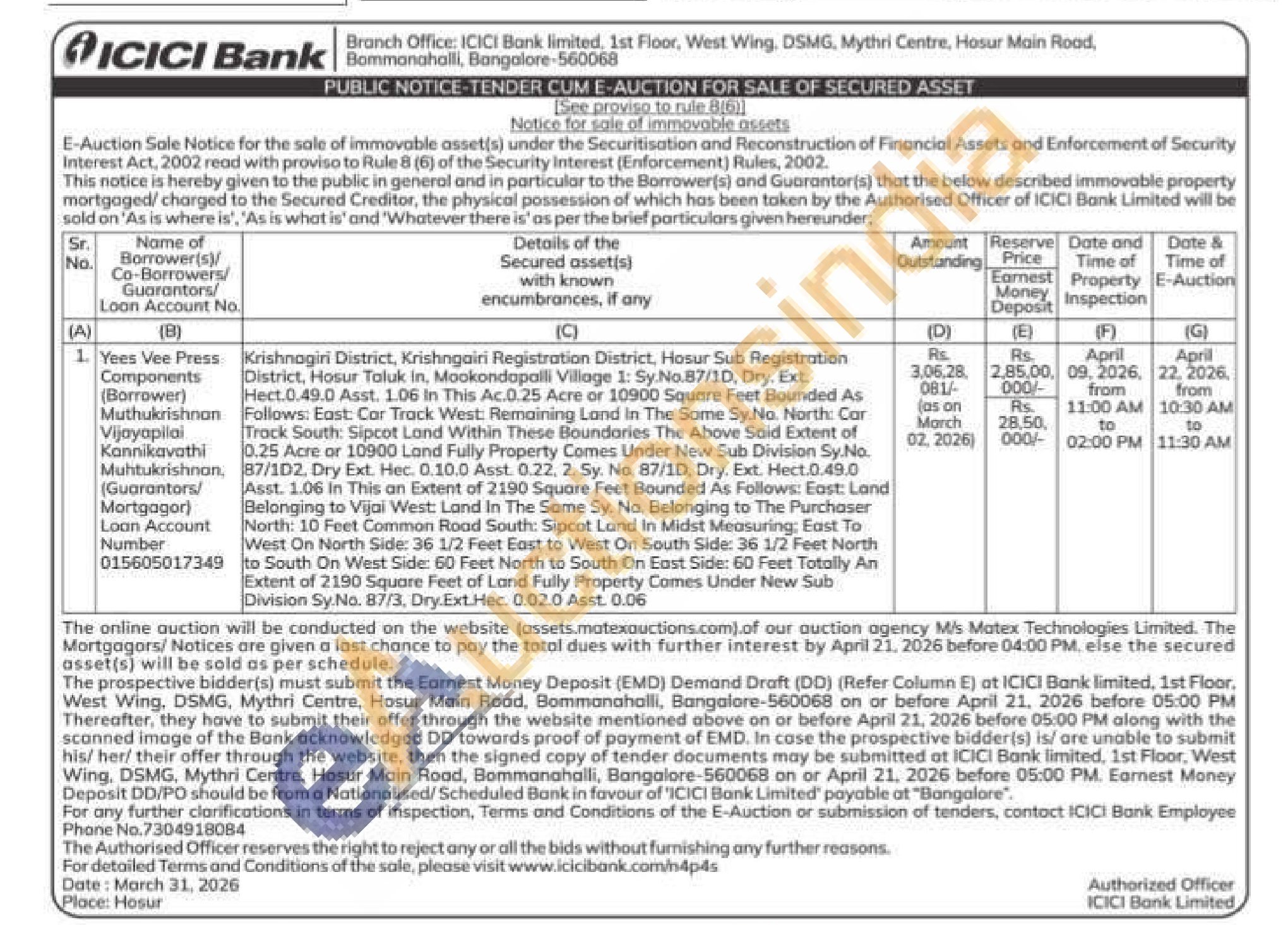 Krishnagiri District, Krishngairi Registration District, Hosur Sub Registration District, Hosur Taluk in, Mookondapalli Village 1: Sy.No.87/1D, Dry. Ext. Hect.0.49.0 Asst. 1.06 In This Ac.0.25 Acre or 10900 Square Feet Bounded As Follows: East: Car Track West: Remaining Land In The Same Sy.No. North: Car Track South: Sipcot Lond Within These Boundaries The Above Said Extent of 0.25 Acre or 10900 Land Fully Property Comes Under New Sub Division Sy.No. 87/1D2. Dry Ext. Hec. 0.10.0 Asst. 0.22. 2. Sy. No. 87/1D. Dry. Ext. Hect.0.49.0 Asst. 1.06 In This an Extent of 2190 Square Feet Bounded As Follows: East: Land Belonging to Vijai West: Land In The Same Sy. No. Belonging to The Purchaser North: 10 Feet Common Road South: Sipcot Land In Midst Measuring: East To West On North Side: 36 1/2 Feet East to West On South Side: 36 1/2 Feet North to South On West Side: 60 Feet North to South On East Side: 60 Feet Totally An Extent of 2190 Square Feet of Land Fully Property Comes Under New Sub Division Sy.No. 87/3, Dry.Ext.Hec. 0.02.0 Asst. 0.06