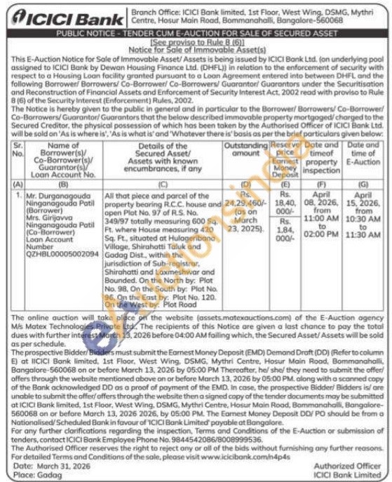 All that piece and parcel of the property bearing RC.C. house and open Plot No. 97 of R.S. No. 349/97 totally measuring 600 Sq. Ft. where House measuring 420 Sq. Ft, situated at Hulogeribana Village, Shirahotti Taluk and QZHBL00005002094 Gadag Dist., within the jurisdiction of Sub-registrar, Shirahatti and Laxmeshwar and Bounded. On the North by: Plot No. 98. On the South by: Plot No 96. On the East by: Plot No. 120. On the West by: Plot Road