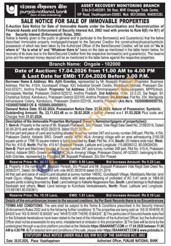 1. Item-A: Property in the name of Mr. Bojepalli Prakasam, Sio. Prasad, Vide Regd Sale Deed No. 2158/2016, Dated 30-05-2016 and with vide MOD 28/2019, dated 03.01.2019, All that part and piece of Land and building situated at survey number 247 and survey number 248 part, Plot No. 415A Prakasam District, Addanki SRO- Growth center, APIIC IALA- Annangi village with an area admeasuring 2150.58 square yards or 1798.15 square meters is being bounded by: East: Plot No. 414, South: 20 meters wide road, West: Plot No. 415-B, North: Plot No. 415 A/1 Bojepalli Peraiah, Latitude and Longitude: (15.68095312, 80.00639439) Item-B: Plant and Machinery located at survey number 247 and survey number 248 part, Plot No. 415-A, Prakasam District, Addanki SRO-Growth center, APIIC IALA-Annangi Village, Prakasam District, AP-523001, belonging to M/s. Ajith Granites, represented by Proprietor Mr. Bojepalli Prakasam, S/o Shri Prasad.
