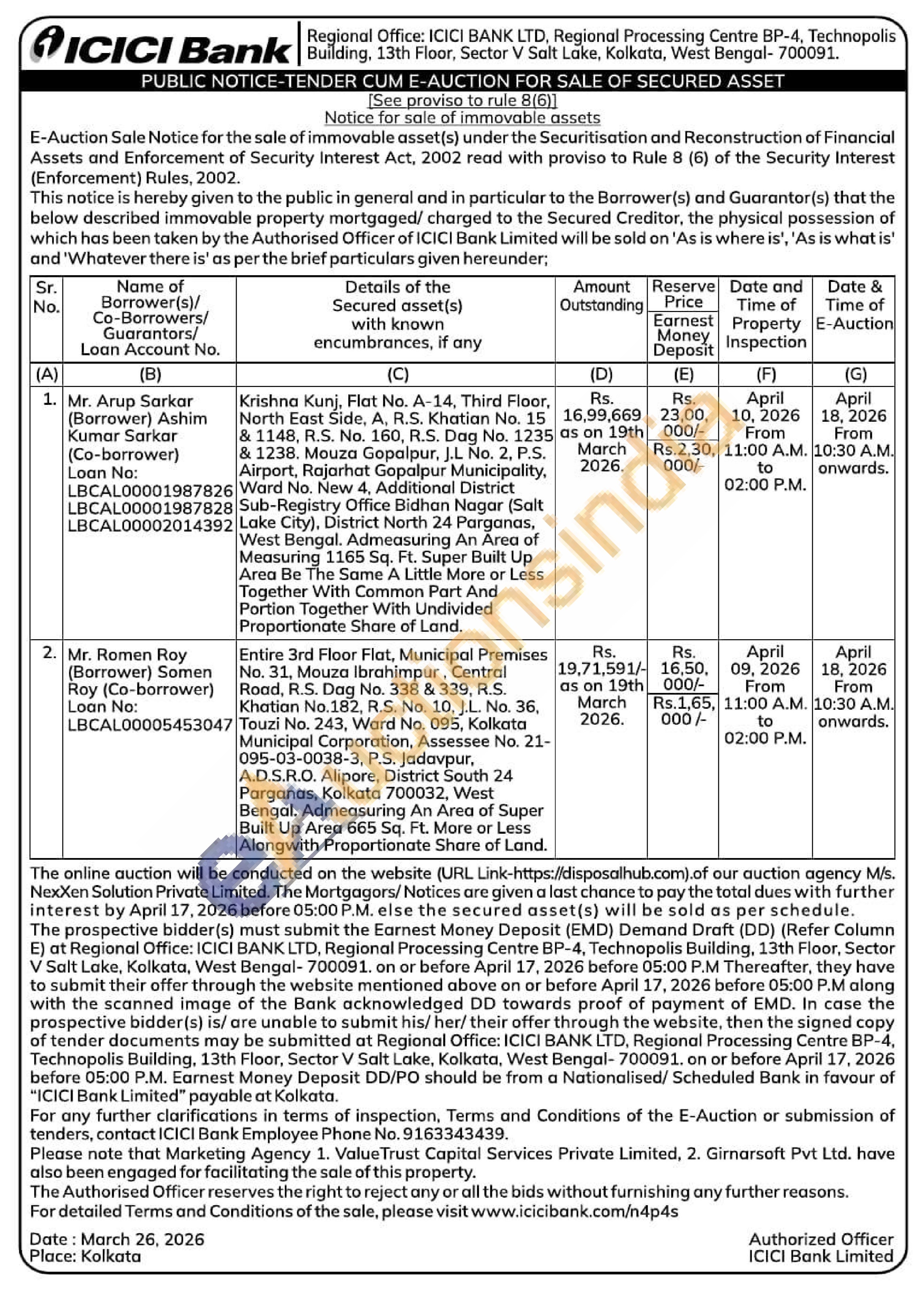 Krishna Kunj, Flat No. A-14, Third Floor, North East Side, A, R.S. Khatian No. 15 & 1148, R.S. No. 160, R.S. Dag No. 1235 & 1238. Mouza Gopalpur, J.L No. 2, P.S. Airport, Rajarhat Gopalpur Municipality Ward No. New 4, Additional District Sub-Registry Office Bidhan Nagar (Salt Lake City), District North 24 Parganas, West Bengal. Admeasuring An Area of Measuring 1165 Sq. Ft. Super Built Up Area Be The Same A Little More or Less Together With Common Part And Portion Together With Undivided Proportionate Share of Land.