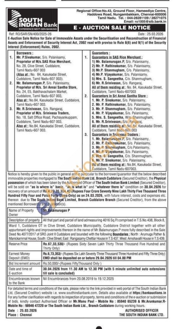 All that part and parcel of land admeasuring 4016 Sq.Ft comprised in T.S.No. 438, Block 8, Ward 1, Cuddalore OT in Clive Street, Cuddalore Municipality, Cuddalore District together with all other appurtenant rights and improvements thereon in the name of Mr. Balamurugan. P more fully described in the Sale Deed No.4077/2017 of SRO Joint II Cuddalore