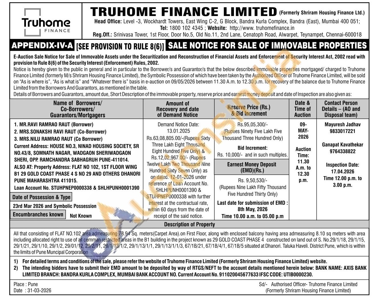 All that consisting of FLAT NO.102 area admeasuring 78.94 Sq. meters(Carpet Area).on First Floor, along with enclosed balcony having area admeasuring 8.10 sq meters with area including allocated right to use of all comman restricted areas in the B1 building in the project known as 29 GOLD COAST PHASE 4 constructed on land out of S. No.29/1/18, 29/1/15, 29/1/21, 29/1/10, 29/1/2, 29/01/12, 29/2/11, 29/1/13/1/2, 29/1/13/1/1, 29/1/13/1/1/3, 67/18/21, 67/18/4/1, 67/18/5 situated at Dhanori. Taluka Haveli. District Pune, which is within the limits of Pune Muncipal Corporation
