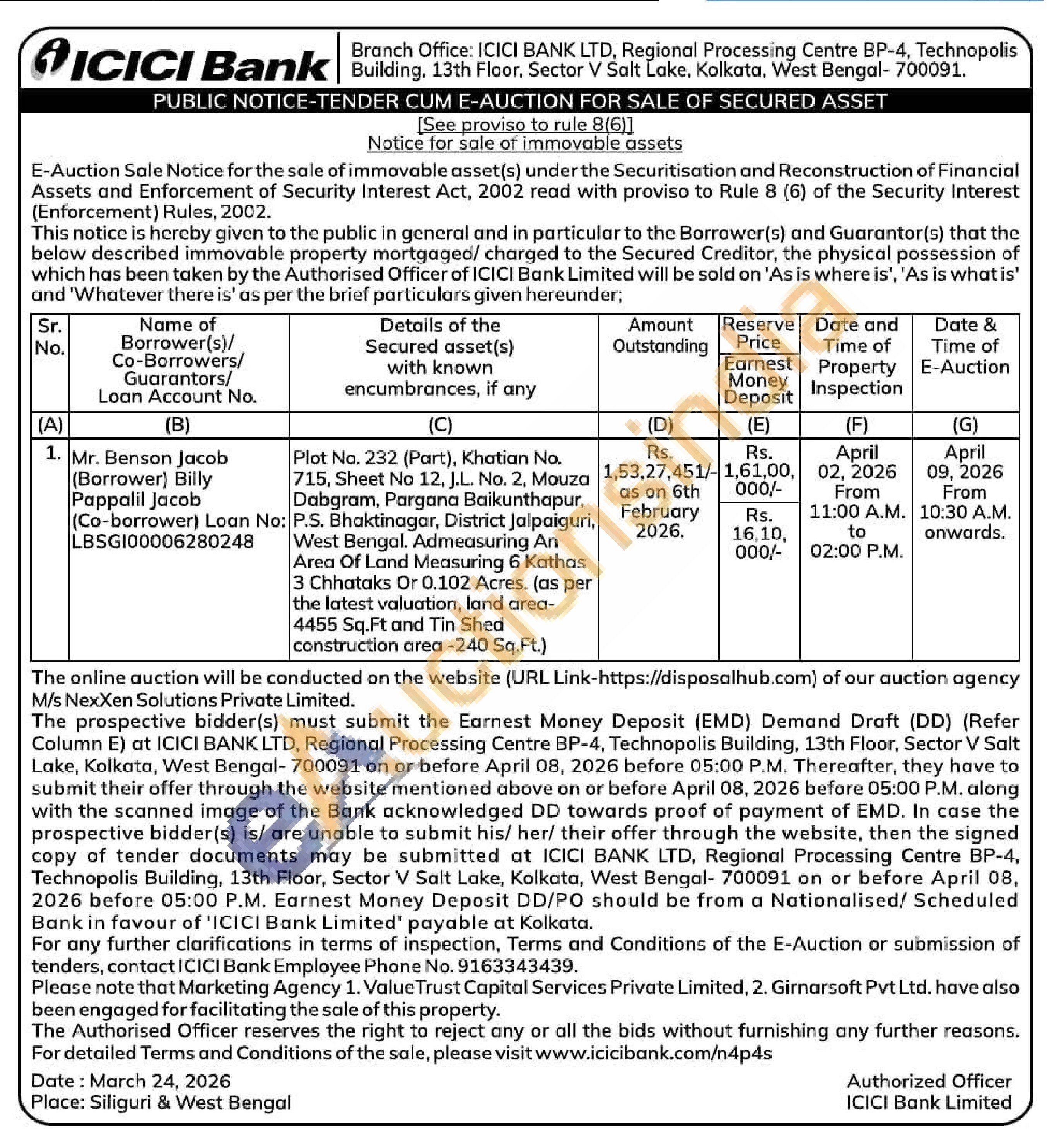 Plot No. 232 (Part), Khatian No. 715, Sheet No 12, J.L. No. 2, Mouza Dabgram, Pargana Baikunthapur, P.S. Bhaktinagar, District Jalpaiguri West Bengal. Admeasuring An Area Of Land Measuring 6 Kathas 3 Chhataks Or 0.102 Acres. (as per the latest valuation, land area-4455 Sq.Ft and Tin Shed construction area -240 Sq.Ft.