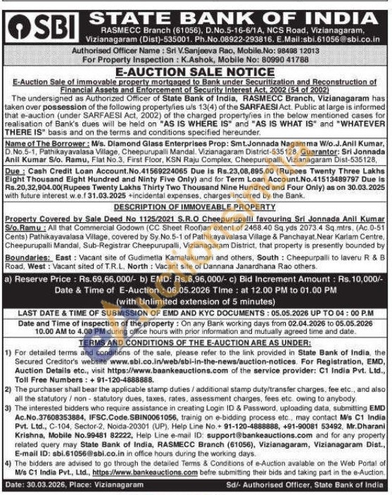 All that Commercial Godown (CC Sheet Roof an extent of 2468.40 Sq. yds 2073.4 Sq.mtrs, (Ac.0-51 Cents) Pathikayavalasa Village, covered by Sy. No.5-1 of Pathikayavalasa Village & Panchayat. Near Karlam Centre, Cheepurupalli Mandal, Sub-Registrar Cheepurupalli, Vizianagaram District, that property is presently bounded by Boundaries: East: Vacant site of Gudimetla Kamalakumari and others, South: Cheepurpalli to laveru R & B Road, West: Vacant sited of T.R.L, North: Vacant site of Dannana Janardhana Rao others