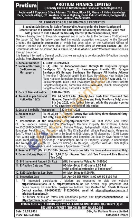 Descriptions of the Immovable Property/Properties: All That Piece And Parcel Of The Property Bearing As Per Panchayath Records Property No.191/86/4, E-Katha No.150300400600100252, Situated At Thindlu Village, Jadigenahalli Hobli, Hoskote Taluk, Bangalore Rural District, Presently Within The Khajihosahali Village Panchayath, Measuring East To West 18.288 Meter And North To South 6.4008 Meter, In All Measuring 117.06 Square Feet, Along With Building Constructed Thereon And Bounded On: East By: Own Property And Road, West By: Property Belongs To Chandrappa, North By: Property Belongs To Chandrappa And Narayanappa, South By: Property Belongs To Marappa, Together With All Other Rights, Buildings, Improvements, And Easements Appurtenant Thereto.