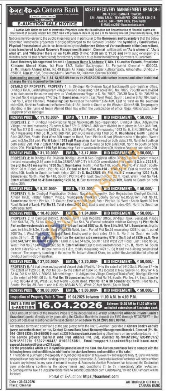 All that piece and parcel of Vacant plots (Plot No 15-to the extent of 1440 Sq. ft. Plot no 37-to the extent of 1520 Sq. ft, Plot No 38-to the extent of 1504 Sq. ft.) located at New Survey no. 866/1A1A & 3A1A, Old S. no 866/1.866/3A, Maruthi Nagar-II, Adiyanuthu Village, Dindigul Taluk (East), Dindigul District to the extent of 4464.00 Sq. ft. Plot No: 15 boundaries: North: Plot No. 14, South Plot No. 37. East: Land in S. No: 866/44 & 2C, West 20 feet North-South Road. Plot No: 37 & 38 boundaries: North: Plot No.15, South: Plot No. 39. East: Land in S. No: 866/4A & 2C, West: 20 feet North-South Road