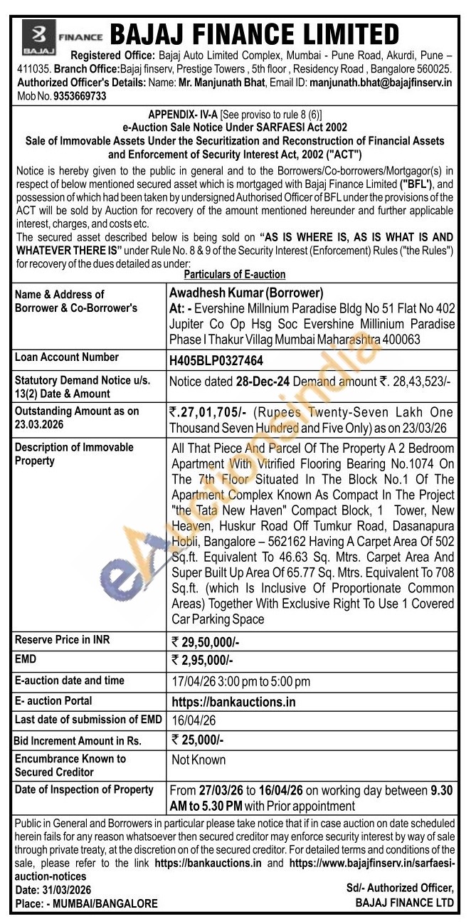 All That Piece And Parcel Of The Property A 2 Bedroom Apartment With Vitrified Flooring Bearing No.1074 On The 7th Floor Situated In The Block No.1 Of The Apartment Complex Known As Compact In The Project "the Tata New Haven" Compact Block, 1 Tower, New Heaven, Huskur Road Off Tumkur Road, Dasanapura Hobli, Bangalore-562162 Having A Carpet Area Of 502 Sq.ft. Equivalent To 46.63 Sq. Mtrs. Carpet Area And Super Built Up Area Of 65.77 Sq. Mtrs. Equivalent To 708 Sq.ft. (which Is Inclusive Of Proportionate Common Areas) Together With Exclusive Right To Use 1 Covered Car Parking Space