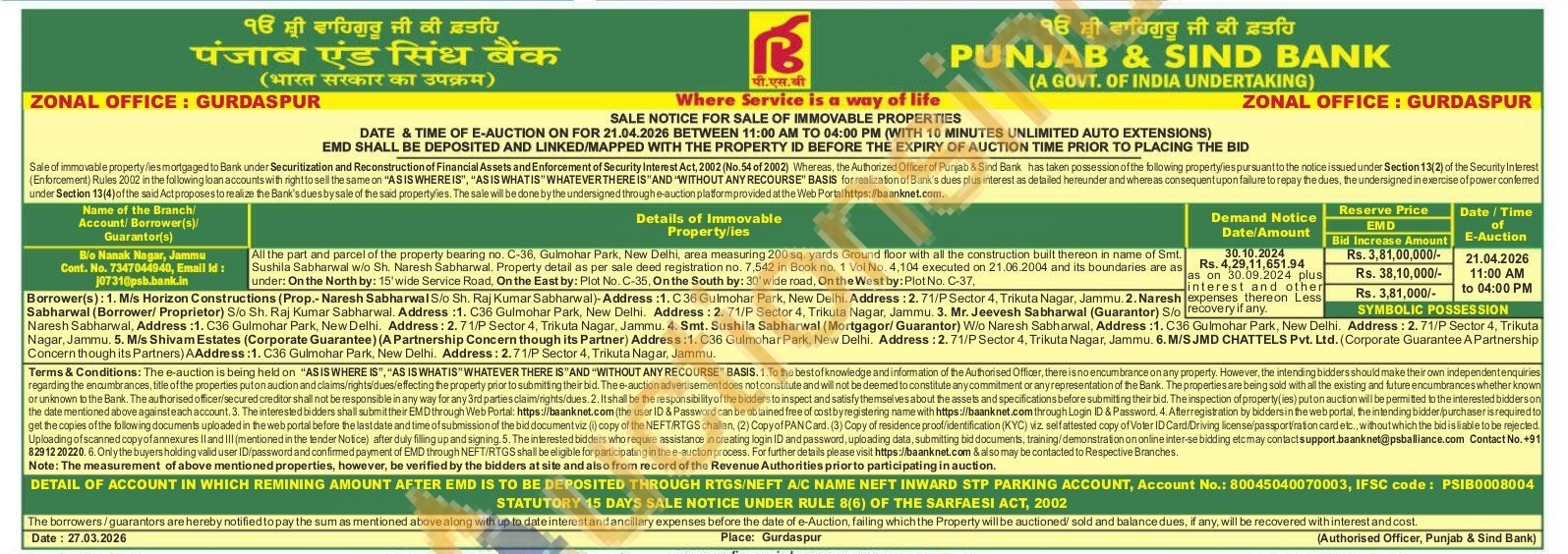 All the part and parcel of the property bearing no. C-36, Gulmohar Park, New Delhi, area measuring 200 sq. yards Ground floor with all the construction built thereon in name of Smt. Sushila Sabharwal w/o Sh. Naresh Sabharwal. Property detail as per sale deed registration no. 7,542 in Book no. 1 Vol No. 4,104 executed on 21.06.2004 and its boundaries are as under: On the North by: 15' wide Service Road, On the East by: Plot No. C-35, On the South by: 30' wide road, On the West by: Plot No. C-37,