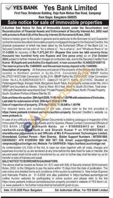 All that piece and parcel of the property of the Residential Site No.3C located in Northern portion in Sy No.21/4, Converted Sy.21/4, BBMP Katha No.270/21/4/3C(Vide Convension Sy No.21/4, BBMP Katha No.270/21/4/3C (Vide Conversion Order No.A.L.N. (S)KEN/43/2016-17, Dated 27-10-2017) Katha no 21/4/30 Situated at PattanagereVillage, Kengeri Hebli, Bangalore South Taluk, the property comes under the imits BBMP and bounded as follows: East to West-80-0 feet, North to South-20-0 feet, Total aren-1600 sqft (Residential vacant land) East: Private Property, West: Road, North: Private Property South: Southerm Portion of Same Site No.3C