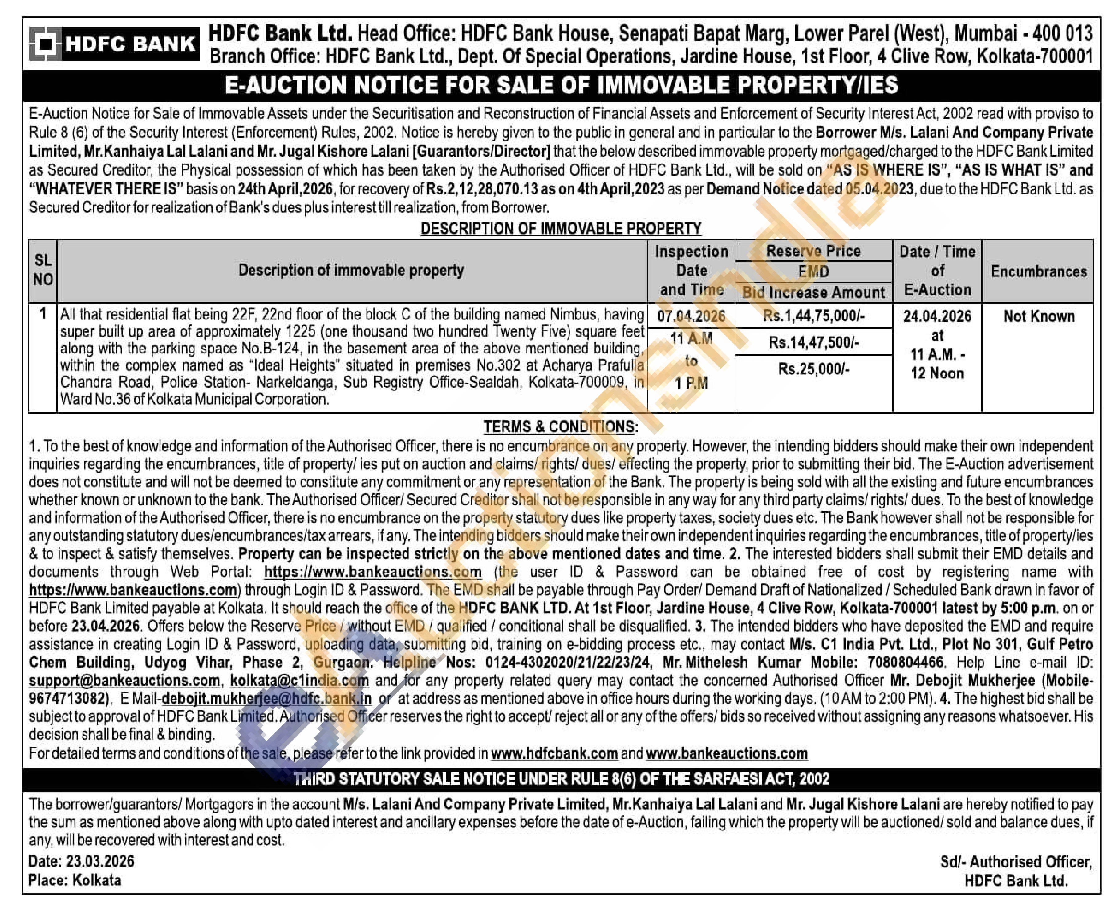 All that residential flat being 22F, 22nd floor of the block C of the building named Nimbus, having super built up area of approximately 1225 (one thousand two hundred Twenty Five) square feet along with the parking space No.B-124, in the basement area of the above mentioned building, within the complex named as "Ideal Heights" situated in premises No.302 at Acharya Prafulla Chandra Road, Police Station- Narkeldanga, Sub Registry Office-Sealdah, Kolkata-700009, in Ward No.36 of Kolkata Municipal Corporation.